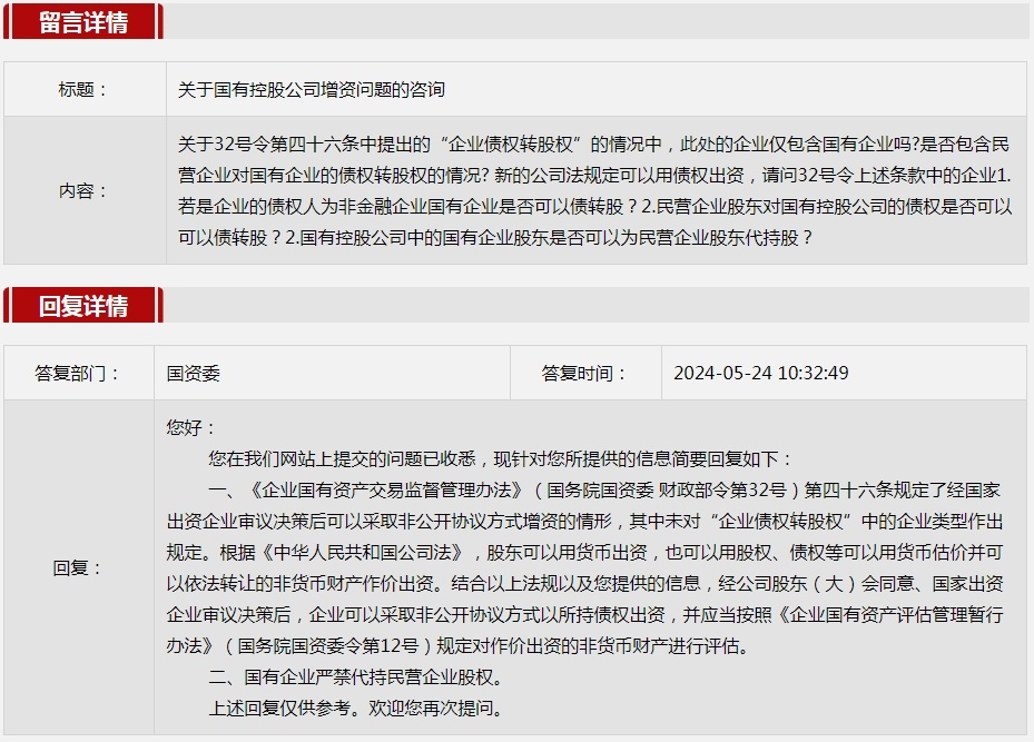 2024年5月國資委網(wǎng)站政務(wù)咨詢欄目部分網(wǎng)友提出的咨詢,我們初步做出了認(rèn)真的回應(yīng),現(xiàn)選擇五條關(guān)注度高、點(diǎn)擊量高的問題,再次推薦分享。