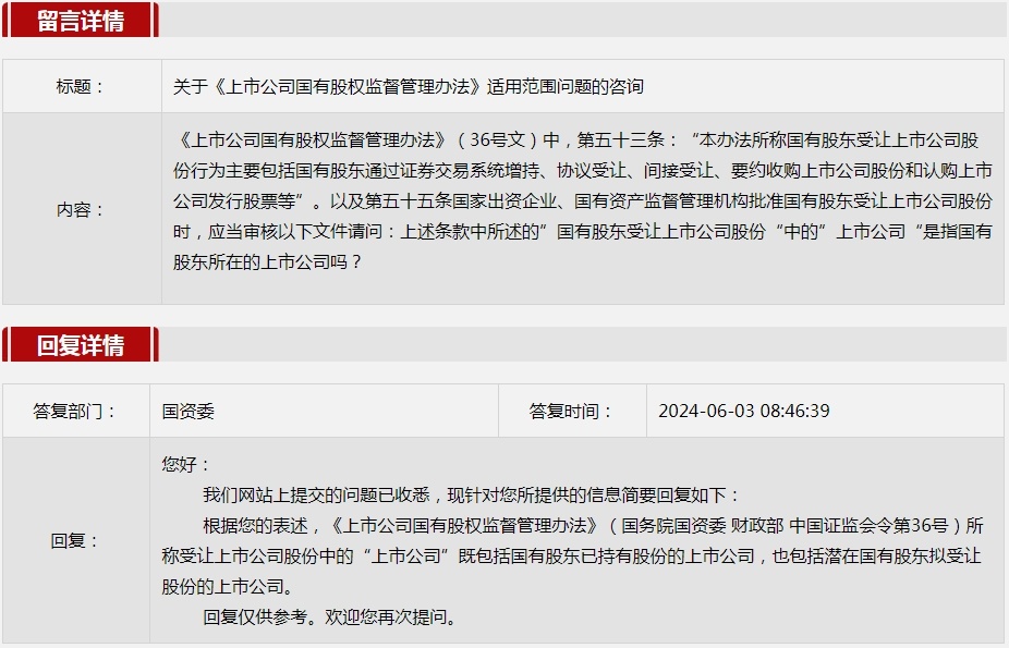 1.關(guān)于《上市公司國有股權(quán)監(jiān)督管理辦法》適用范圍問題的咨詢