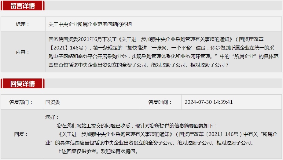 2024年7月國(guó)資委網(wǎng)站政務(wù)咨詢欄目部分網(wǎng)友提出的咨詢,我們初步做出了認(rèn)真的回應(yīng),現(xiàn)選擇五條關(guān)注度高、點(diǎn)擊量高的問(wèn)題,再次推薦分享。