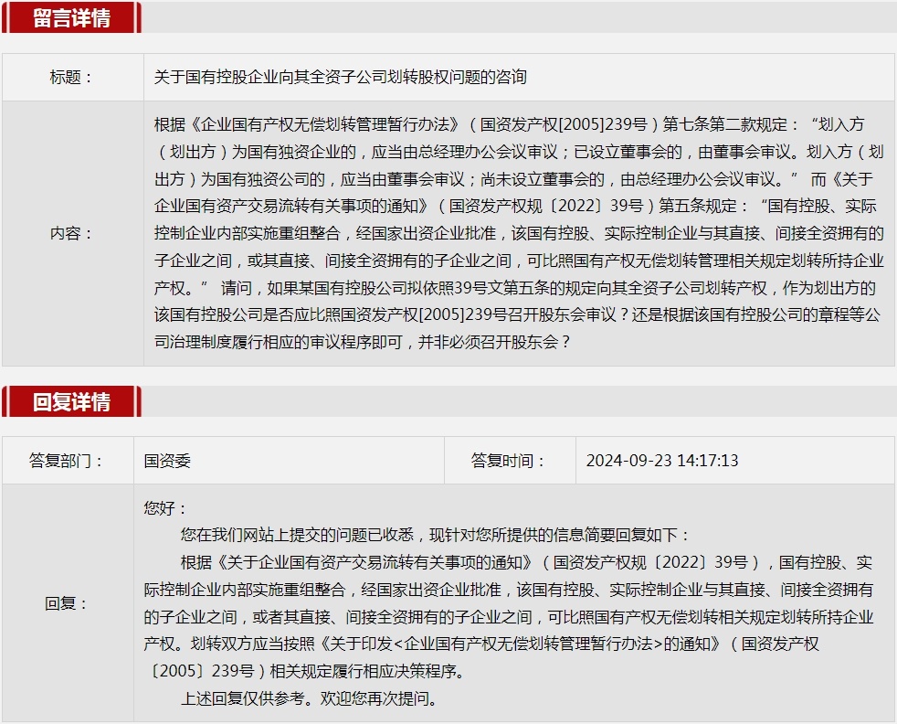 4.關(guān)于國有控股企業(yè)向其全資子公司劃轉(zhuǎn)股權(quán)問題的咨詢