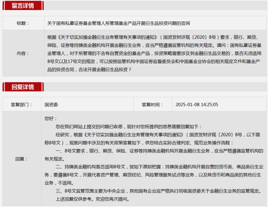 2.關(guān)于國(guó)有私募證券基金管理人所管理基金產(chǎn)品開(kāi)展衍生品投資問(wèn)題的咨詢