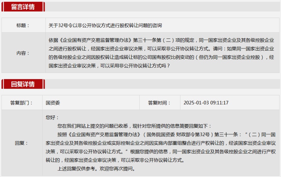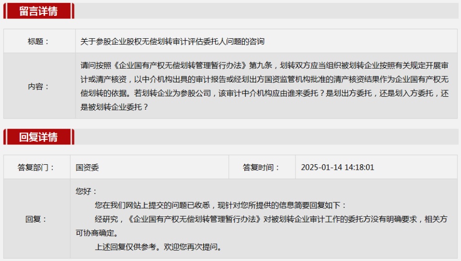 2025年1月國(guó)務(wù)院國(guó)資委網(wǎng)站政務(wù)咨詢欄目部分網(wǎng)友提出的咨詢,我們初步做出了認(rèn)真的回應(yīng),現(xiàn)選擇五條關(guān)注度高、點(diǎn)擊量高的問(wèn)題,再次推薦分享。