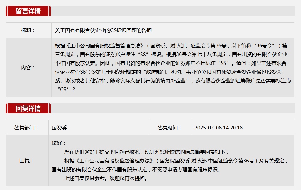 1.關(guān)于國有有限合伙企業(yè)的CS標(biāo)識問題的咨詢