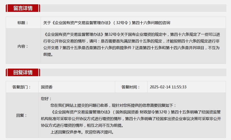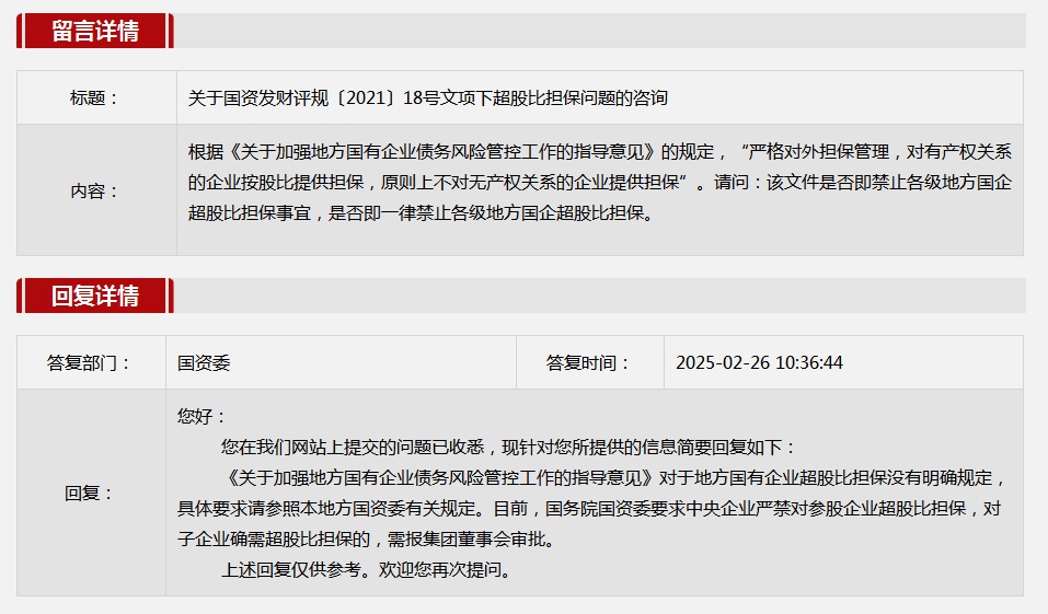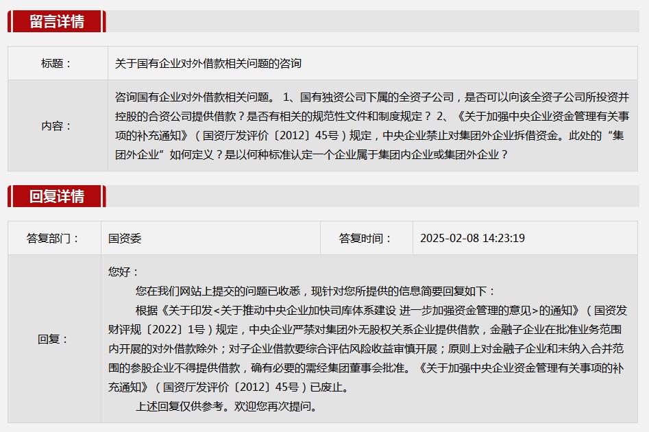 2025年2月國務(wù)院國資委網(wǎng)站政務(wù)咨詢欄目部分網(wǎng)友提出的咨詢,我們初步做出了認(rèn)真的回應(yīng),現(xiàn)選擇五條關(guān)注度高、點(diǎn)擊量高的問題,再次推薦分享。