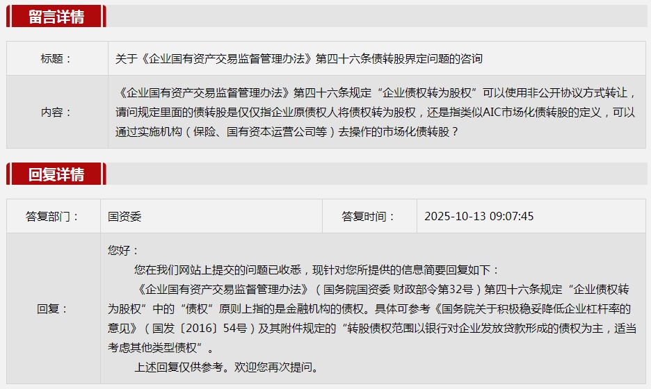 1.關于《企業(yè)國有資產交易監(jiān)督管理辦法》第四十六條債轉股界定問題的咨詢