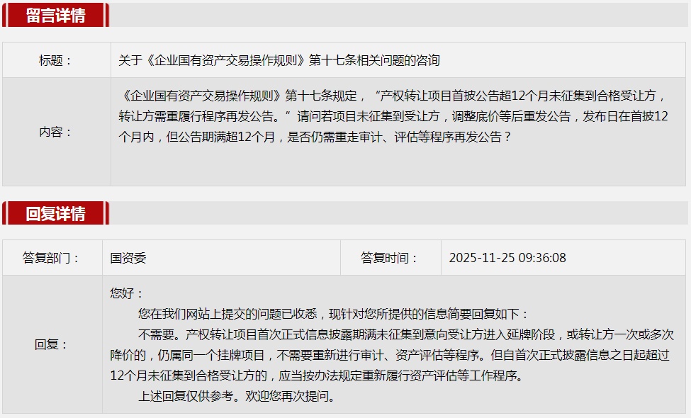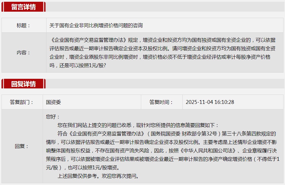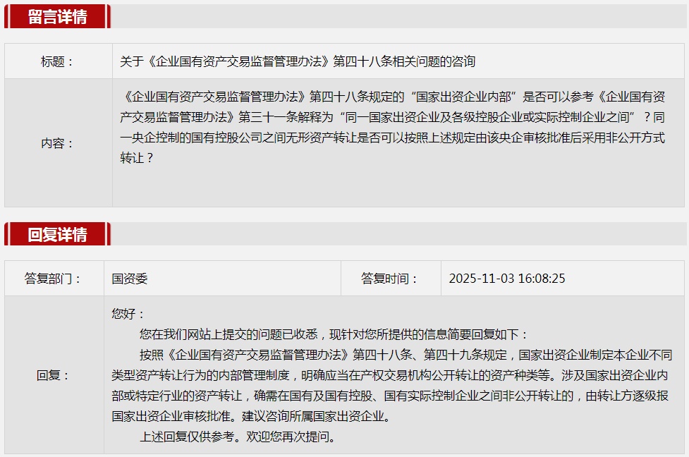 2025年11月國(guó)務(wù)院國(guó)資委網(wǎng)站政務(wù)咨詢欄目部分網(wǎng)友提出的咨詢,我們初步做出了認(rèn)真的回應(yīng),現(xiàn)選擇五條關(guān)注度高、點(diǎn)擊量高的問題,再次推薦分享。