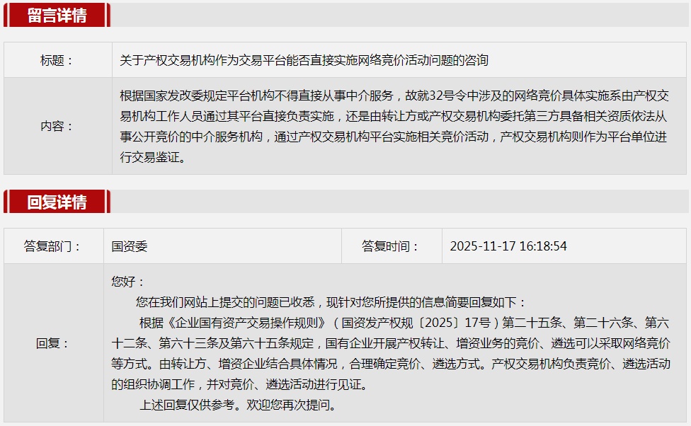 4.關(guān)于產(chǎn)權(quán)交易機(jī)構(gòu)作為交易平臺(tái)能否直接實(shí)施網(wǎng)絡(luò)競(jìng)價(jià)活動(dòng)問題的咨詢