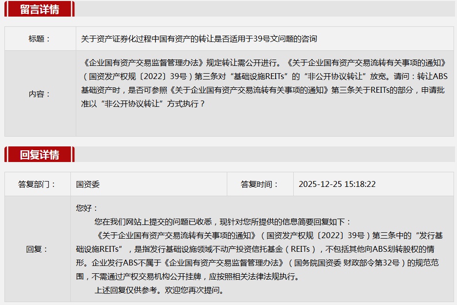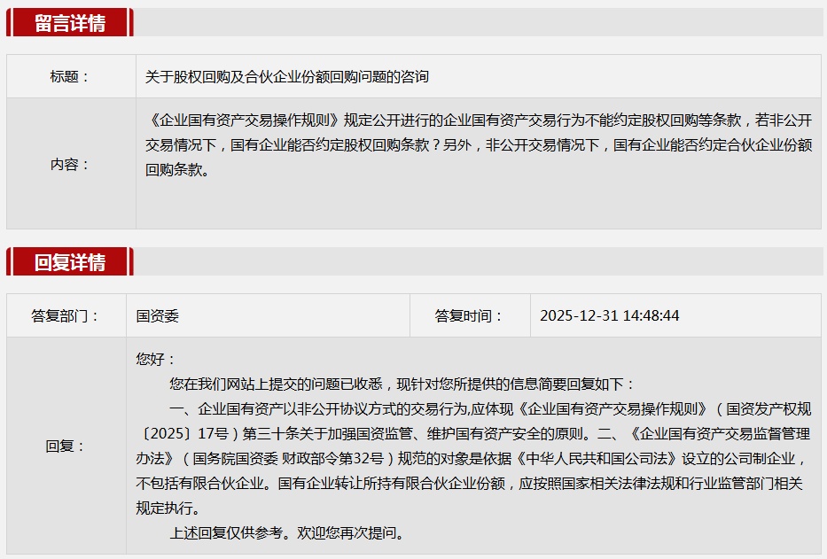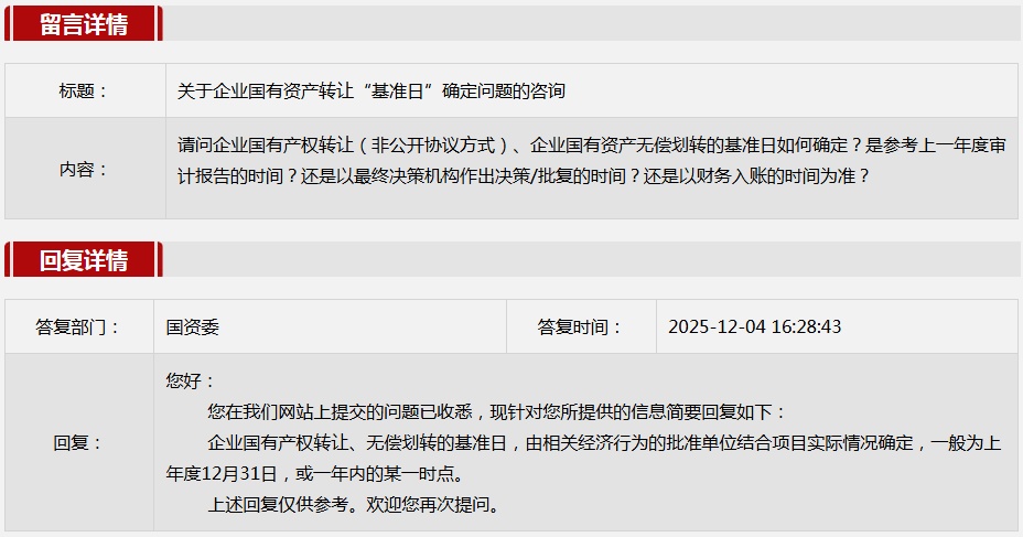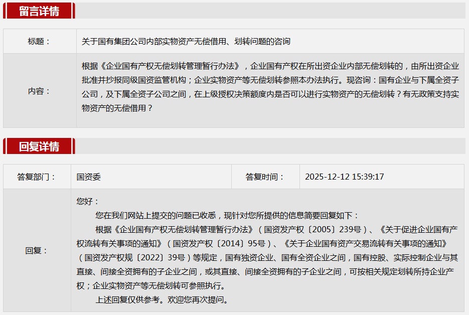 2025年12月國務(wù)院國資委網(wǎng)站政務(wù)咨詢欄目部分網(wǎng)友提出的咨詢,我們初步做出了認(rèn)真的回應(yīng),現(xiàn)選擇五條關(guān)注度高、點擊量高的問題,再次推薦分享。